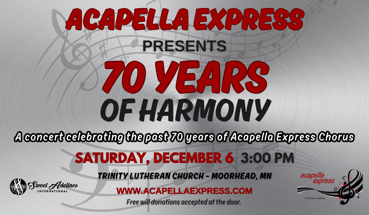 We will be showcasing all of this and more at our 70th Anniversary celebration. Entry is a free will donation to Acapella Express.